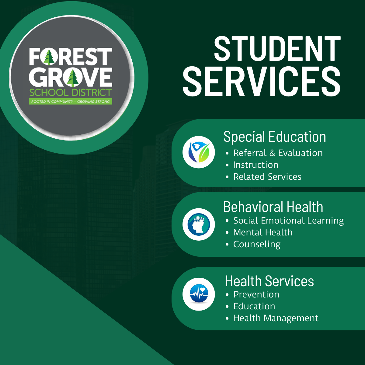 Our vision of a quality Student Services Program in the Forest Grove School District is a collaboration between general and special education, that is comprehensive in scope and that serves the diverse needs and abilities of ALL students.  We believe that our parents are very important members of this collaborative process.